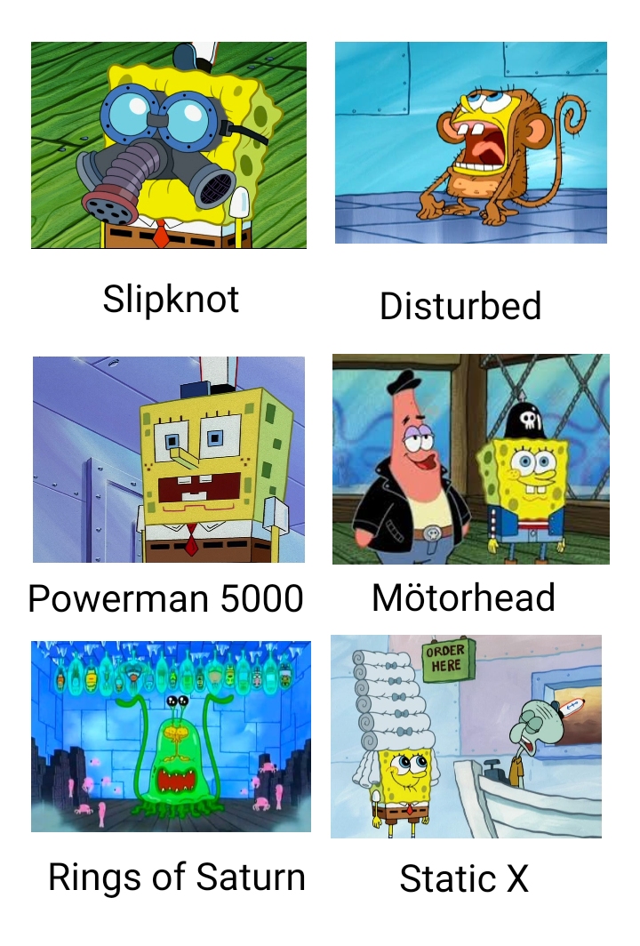 , Abonniere unseren Kanal, um noch mehr von deinen Nickelodeon-Lieblingsserien wie Spongebob Schwammkopf, Teenage . "Corey Taylor Spongebob Squarepants Live in London, KOKO Club 2016", . If you're searching for Spongebob Rock Band Meme subject, Various Bands Portrayed by Spongebob, I say "various bands" instead of "rock and metal" because I feel like if I consider Limp Bizkit and Kid Rock anywhere near rock or . you have visit the ideal website. Our site always gives you hints for seeing the highest quality pic content, please kindly hunt and locate more enlightening articles and images that fit your interests.